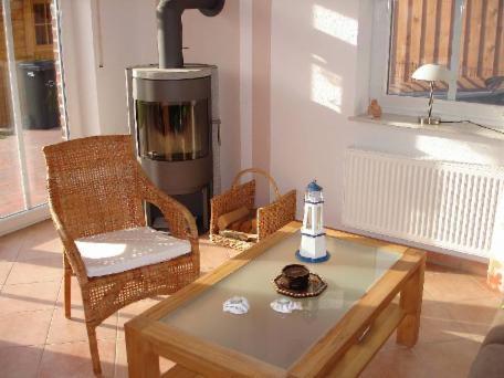 kombiniertes Wohn- und Esszimmer mit Kaminofen sowie mit großer Küchenzeile